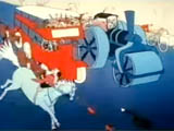 The soundtrack was processed normally in black-and-white on the print stock, along with a very pale version of the green image record. This gave a light grey "ghosted" version of the image, which helped define and crispen the final image, as was often employed in the paper print industry. This print was then prepared with a coating of gelatin, with a little albumen added to inhibit the dye from spreading, and coloured by dye-transfer from the three matrix films. As each matrix was the negative of the colour value that created it, it was used to transfer the opposite (complementary) colour dye – the blue record carried the yellow dye, the red record carried the cyan dye and the green record carried the magenta dye. They were transferred in that order, as there was a tendency for the transfer process to smudge the previous dye. The definition of the yellow layer was least important to the crispness o the image, and the magenta was the most important. Interest in colour was at a low ebb among Hollywood studios in 1932, so interest needed to be stimulated. On the other hand, in order to cope with the expected demand for the new system, Bell and Howell, who manufactured the cameras for Technicolor, needed time to provide a sufficient number of new cameras. Since animation studios could use their normal rostrum camera to provide the necessary three colour records on one reel by shooting each frame three times, rotating the three filters, Technicolor boss Herbert T Kalmus approached various animation studios with his system. Only Walt Disney was prepared to try the new system, with its added cost and need to experiment with coloured paints, as a means of improving the sales of his Silly Symphony series, which was not performing as well as hoped. The Silly Symphony currently in production, Flowers and Trees, was re-worked as a colour cartoon, and proved a great success, going on to win an Academy Award. Disney contracted with Kalmus for exclusive use of Technicolor in animation for the next 2 years, and used it for all subsequent Silly Symphonies. Other animation companies could only compete by using the available 2-colour systems. By the time the exclusivity contract expired Disney had created a demand for coloured cartoons. Apparently Technicolor insisted on shooting the animation themselves – presumably they were anxious to ensure that camera registration, filters and lighting levels were not compromised to the detriment of the system. Some further Symphonies may also have been shot by Technicolor, but eventually Disney had the revolving filter disc installed on his own camera. Kalmus next persuaded Pioneer Films to make a live-action short, La Cucaracha (1934), in the 3-colour process, and commit to making a series of features. With the success of La Cucaracha and Pioneer's first feature Becky Sharp Hollywood welcomed Technicolor with open arms, while Kalmus and his team continued to improve the system. While it could be toned down as required, the principal attraction of the process was its ability to show a very vivid colour palette, suitable for fantasies and emotional or melodramatic productions. These extreme values gave the process its advertising slogan – Glorious Technicolor. Technicolor insisted on total control of its product. The special beamsplitter cameras had to be hired directly from the company, and their technicians and colour consultant (Kalmus's ex-wife Natalie, with the power to veto the chosen colours) were aways present on the set. In 1935 Alexander Korda, who had been a Hollywood director in the late 1920s and whose UK production company London Film Productions was constructing a studio complex at Denham along Hollywood lines after the success of The Private Life of Henry VIII and subsequent features, persuaded Kalmus to build a Technicolor processing laboratory near Denham. Not only would this plant process colour film for Denham, it could also provide the release prints for American films to be shown in Britain, and, being located close to London's Heathrow Airport, it could quickly process and return film from Europe. The British affiliate Technicolor Ltd was promptly formed, and the new laboratory was opened the following year. The first Technicolor film to be made in Britain, Wings of the Morning, started shooting at Denham studios in July 1936 starring US actor Henry Fonda and French actress Annabella as a horse trainer, in Ireland to prepare horses for the Epsom Derby, and the granddaughter of a Spanish gypsy and an Irish nobleman, visiting Ireland with her grandmother. (The plot combined two short stories together and Annabella played both the young gypsy, whose aristocratic husband, played by Leslie Banks, dies after a riding accident, and the granddaughter, with a fianc%eacute;e in Spain, who falls for the handsome young trainer.) Unfortunately the laboratory was not yet ready, so each day's filming had to be sent to Hollywood for processing. London Films produced a Technicolor cartoon short The Fox Hunt in 1936. After the success of Disney's Snow White and the Seven Dwarfs Korda put a feature-length cartoon based on Jules Verne's Around the World in 80 Days into production, but it was halted on the outbreak of War. A reel of Technicolor negatives was found in 1955 and used, with additional animated maps and other linking material, to create a short version, Around the World in 18 Minutes. The British Technicolor had the autonomy to pursue its own research, experimenting with other dye and emulsion chemicals. It gradually developed its own British colour sensibilities, and some of its discoveries were taken up by the parent company. Technicolor V (1954-)The development by Kodak of Eastmancolor in the 1950s resulted in a single chromogenic film that processed as a full colour negative, doing away with the need for a three-strip camera. Prints could be made from the negative by the same process, but to preserve the original negative it was normal practice