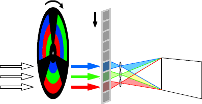The Lee-Turner projection system. As each frame is pulled down the filter wheel turns to the next set of filters. In each set the colour sequence moves down, so the correct colour remains with the frame. The three lenses are adjustable to enable the three frames to be superimposed. In 1902 Charles Urban, an American who had settled in the UK to become a major moving picture distributor, bought out Lee and continued funding development of the system. After Turner suffered a fatal heart attack in 1903, Urban hired filmmaker George Albert Smith to continue the work. But the process was beset with problems: in movement the difference between the three images caused colour fringing. (The ideal solution, that of exposing and projecting three frames at a time was physically impossible - the film could not be moved that fast, with that great a pull-down distance.) Moreover, the weave inherent in motion picture photography meant that the three frames were never perfectly superimposed but shifted constantly against each other. Instead, Smith concentrated on a two-colour system.