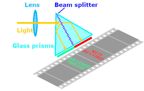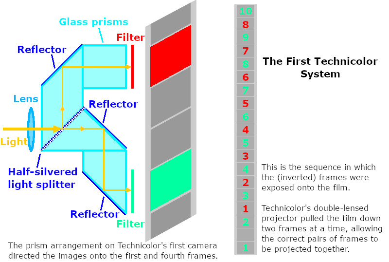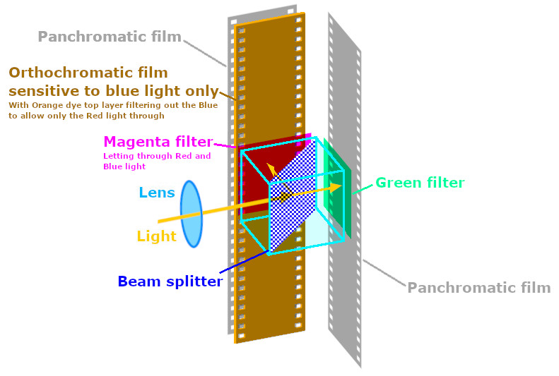 A camera was built which exposed the area of two frames of film at a time, with a prism system that split the image in two, placing one image on the first frame of film and a relected image upside down on the next frame. This produced a negative that could be skip-printed to give a positive print of the the first set of colour-filtered images, then turned upside down to make another positive print (reversing the order of frames) consisting of the second set.